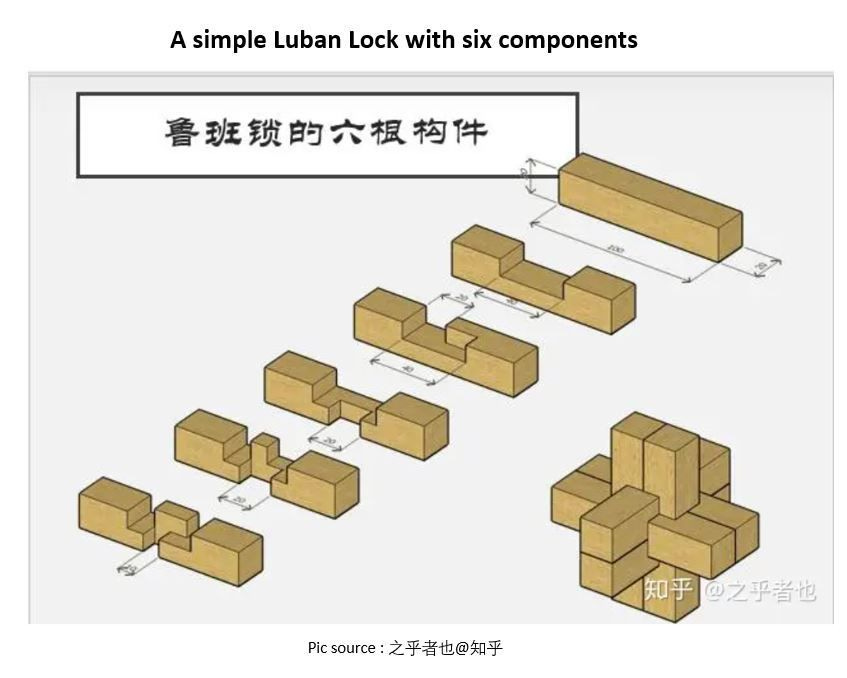 Lu Ban lock also gives one a glimpse into the workings of Mortise and Tenon joint structure (ๆฆซๅฏ็ปๆ) which is a a combination of bumps and joints used on two wood members that help to make a strong joint to develop a robust architecture in ancient China.