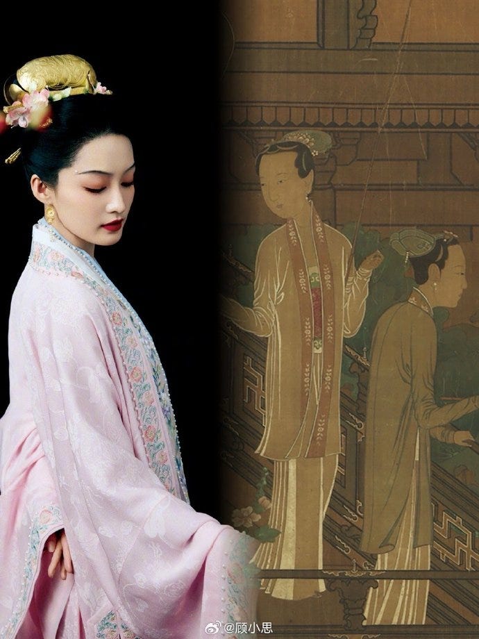 โRefer to Pic 4 above. The attire is known as Song-made ๅฎๅถ Hanfu and is similar to the women in the paintings by acclaimed Song artist Zhou Wenju (ๅจๆ็ฉ) as shown.